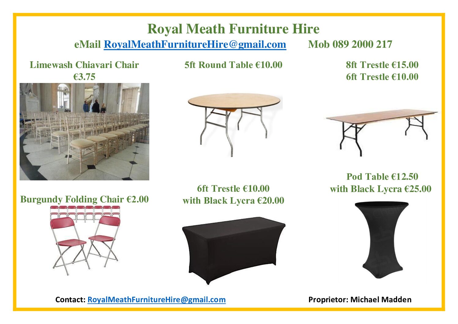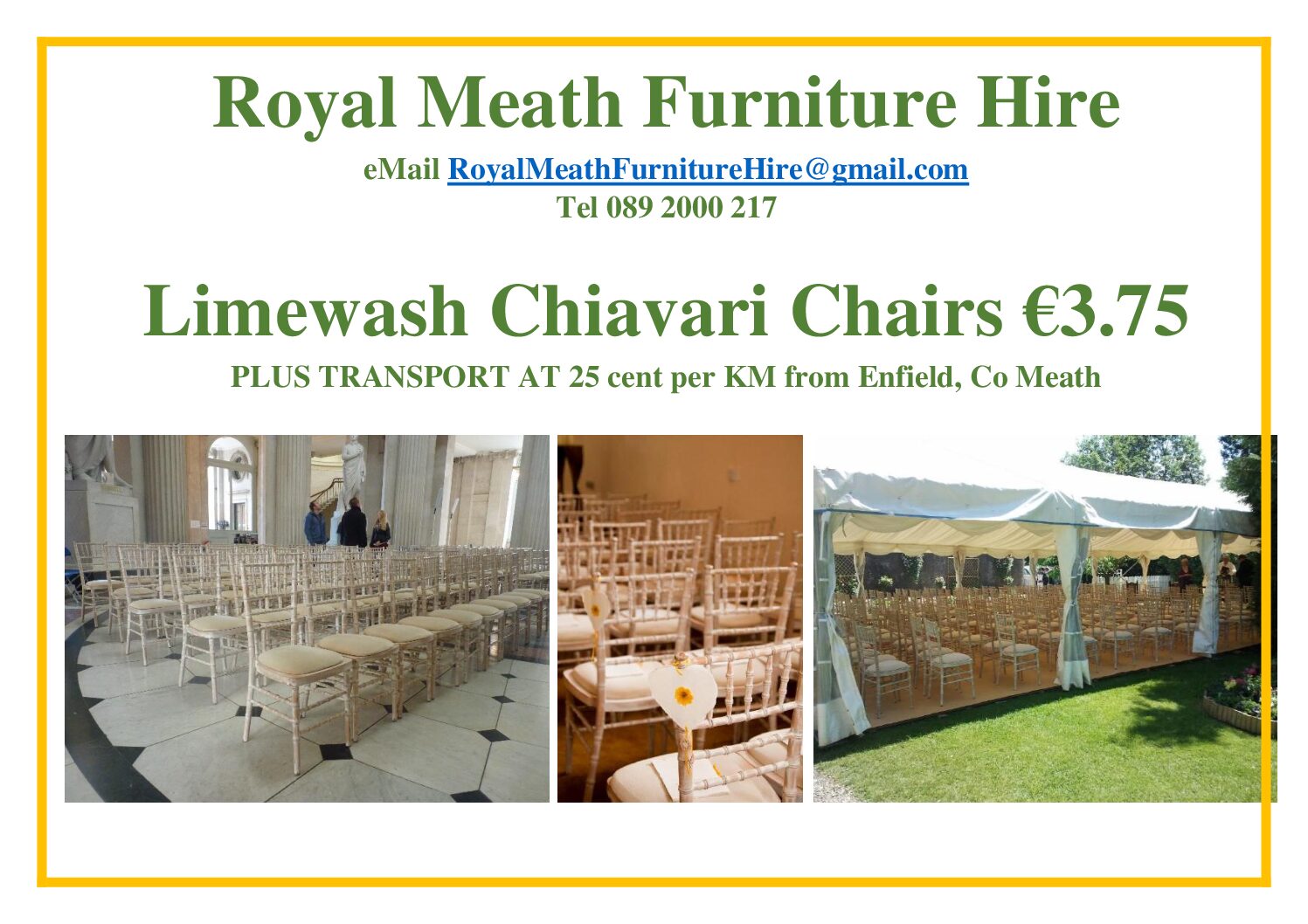 Royal Meath Furniture Hire Limewash Chiavari Chairs €3.50 PLUS TRANSPORT AT 25 cent per KM from Enfield, Co Meath. These chairs are perfect for Events, Occasions and Weddings. Please chat to us today about your funiture hire needs and for all pricing queries. Furniture Pricelist